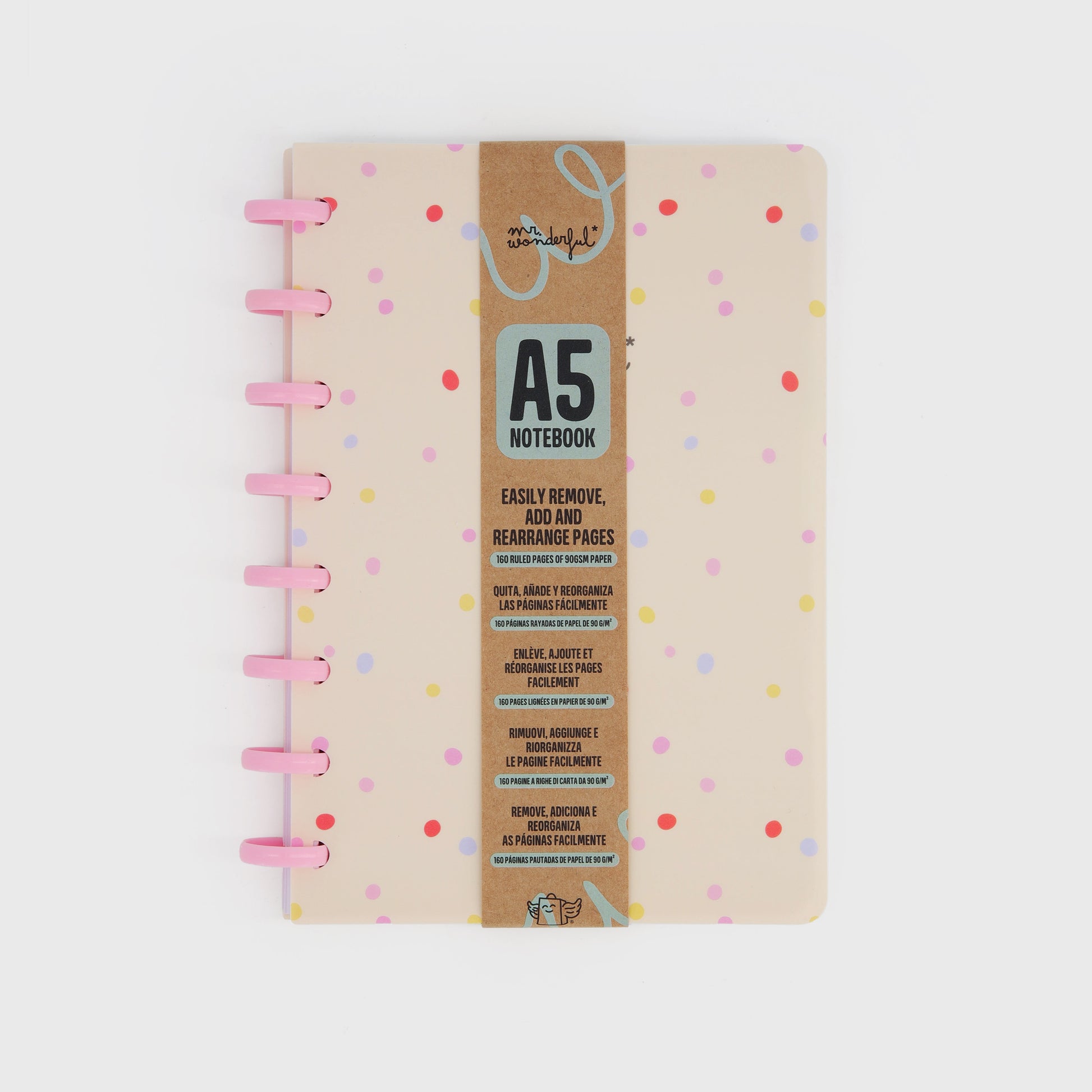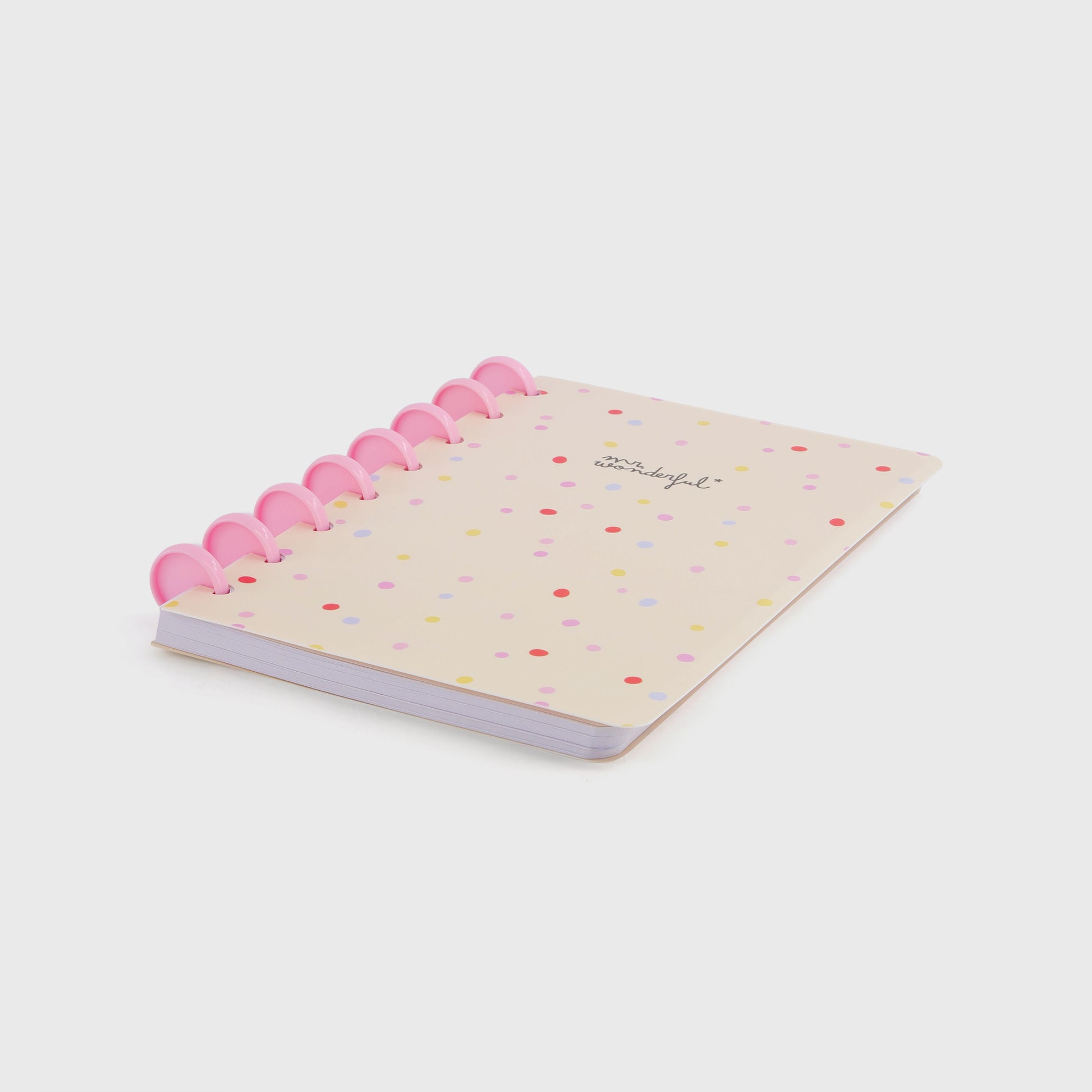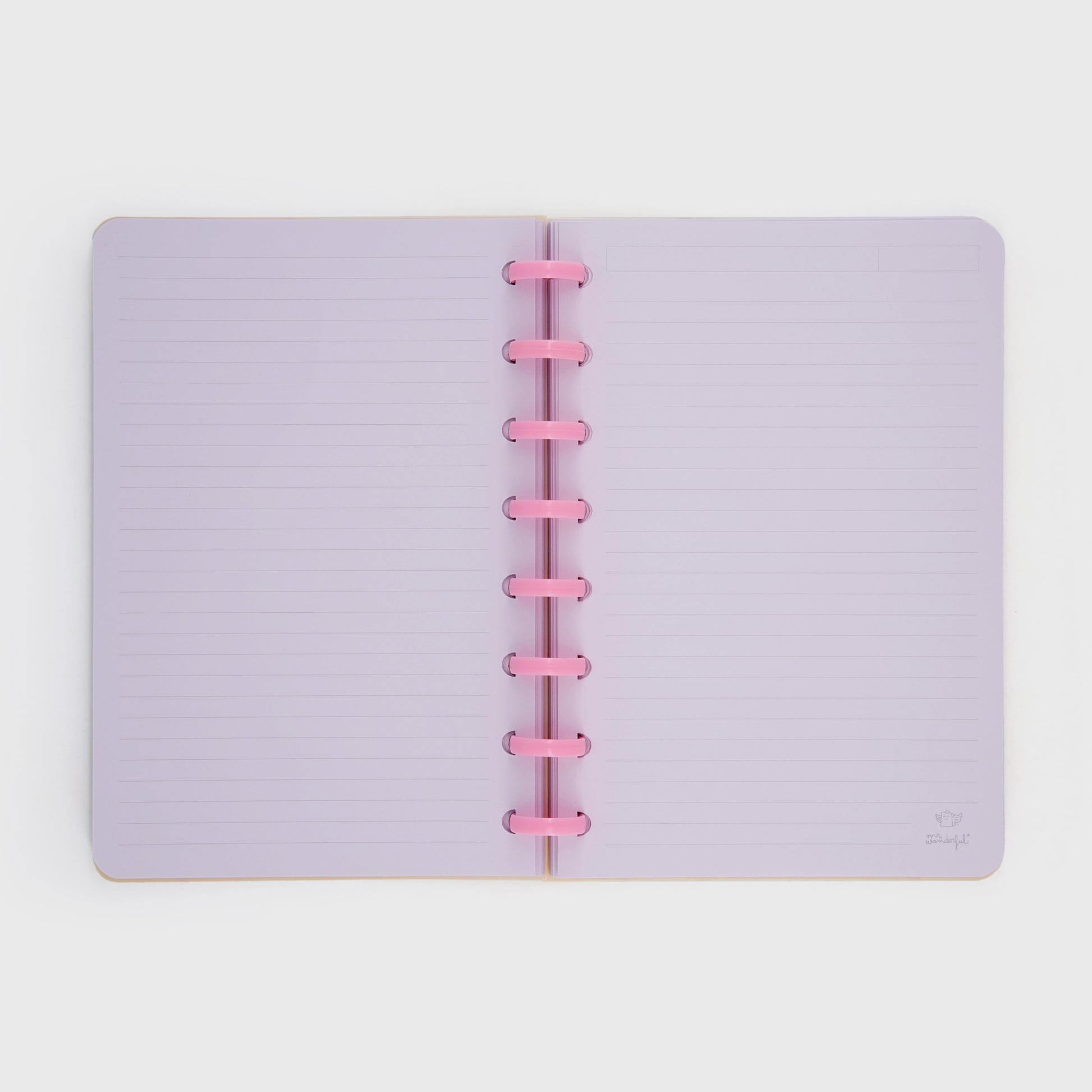 Caderno de tamanho A5, com uma bonita capa de plástico impressa.